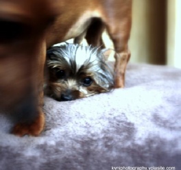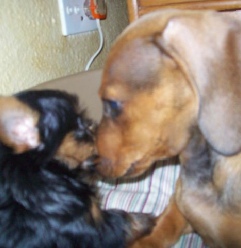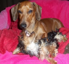 Levi, the Daschund babysitting the puppies